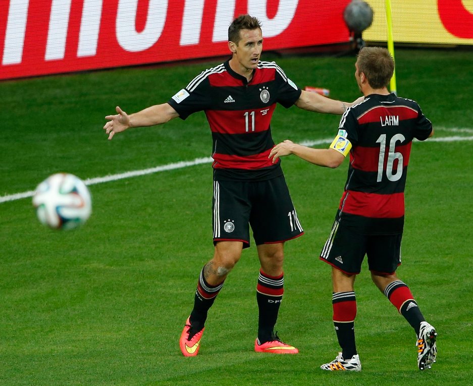 Klose, con su gol, el segundo del partido, suma 16 tantos en cuatro mundiales disputados, convirtiéndose así en el máximo goleador de la historia de la competición. Supera a Ronaldo y éste es el momento en el que lo festeja con su capitán.