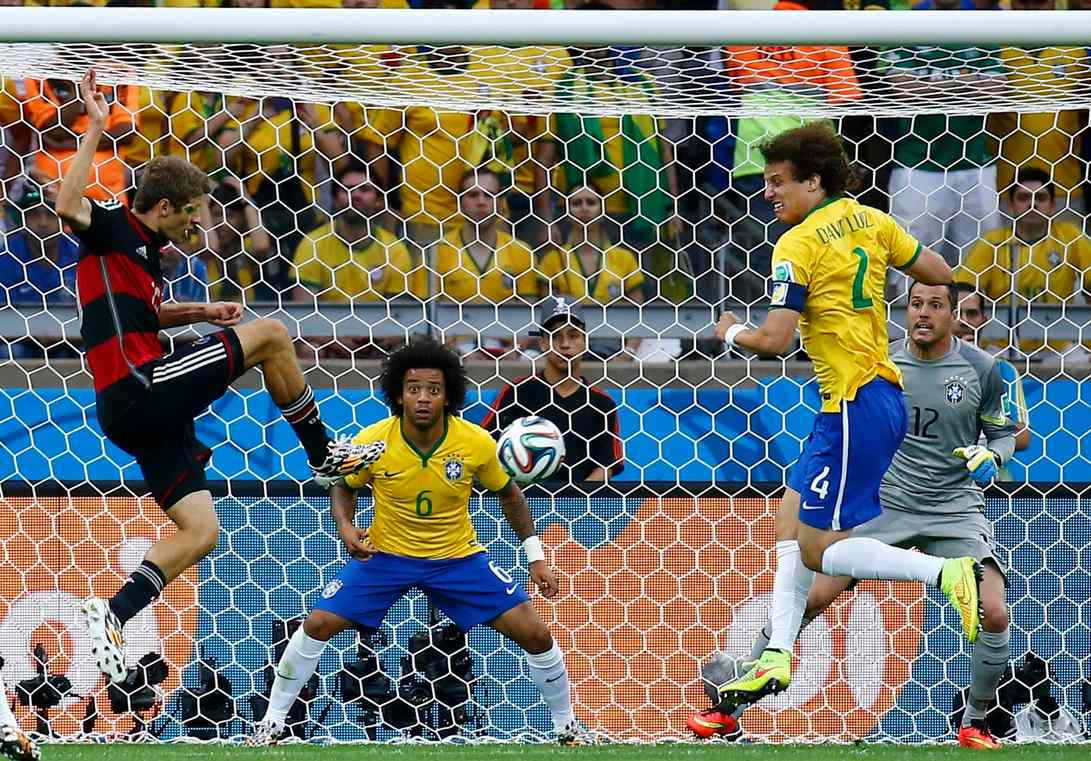 Un fallo en la defensa brasileña en un córner provocó el primer gol de Alemania, que se puede ver en esta imagen, cuando Müller empuja a gol sin oposición.