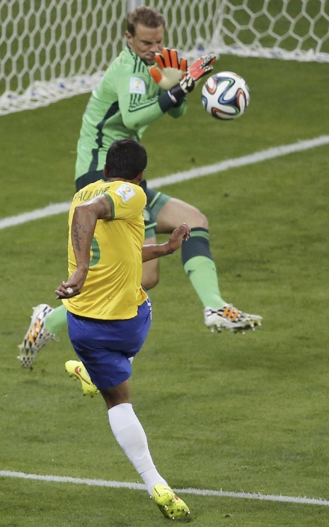 Manuel Neuer, que está realizando un gran Mundial, también brilló esta noche con sus paradas. En la imagen, el portero germano evita el gol de Paulinho, que salió en la segunda mitad.