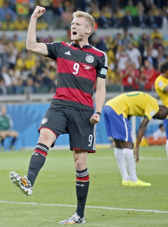 André Schürrle celebra uno de sus dos goles a Brasil, que cayó humillada ante Alemania en la primera semifinal disputada en el Mineirao de Belo Horizonte.