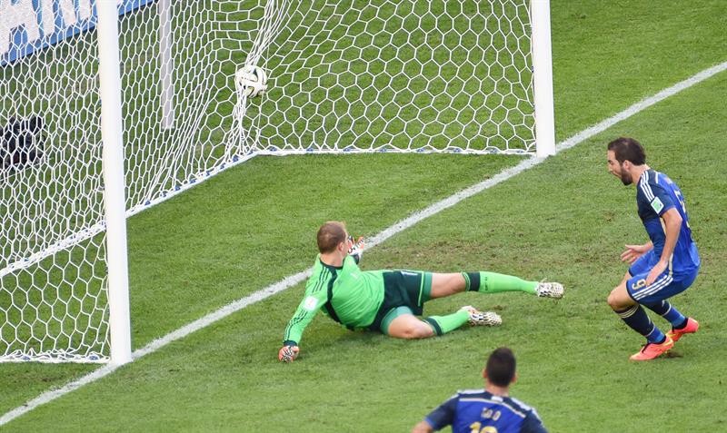 Gonzalo Higuaín pudo adelantar a Argentina en dos ocasiones. En la primera, remató mal cuando estaba sólo delante de Neuer. En la segunda (en la imagen), su gol estuvo bien anulado por fuera de juego tras el centro de Lavezzi desde la izquierda.