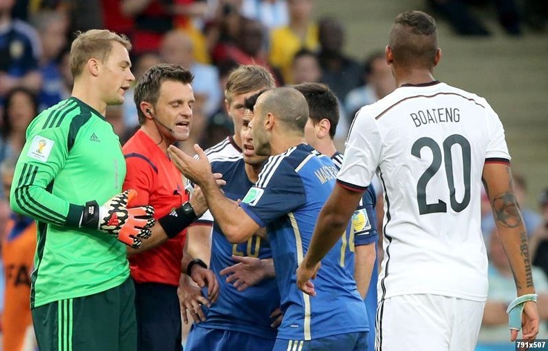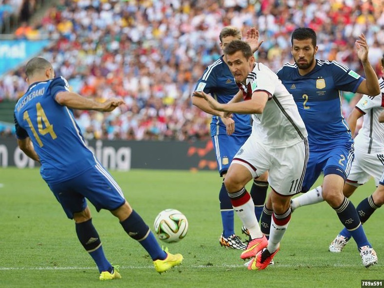 Al poco de comenzar el partido, Miroslav Klose intentó marcharse de Mascherano, cuando ya había dejado atrás a Garay. Pero el jefecito Mascherano evita la ocasión alemana.