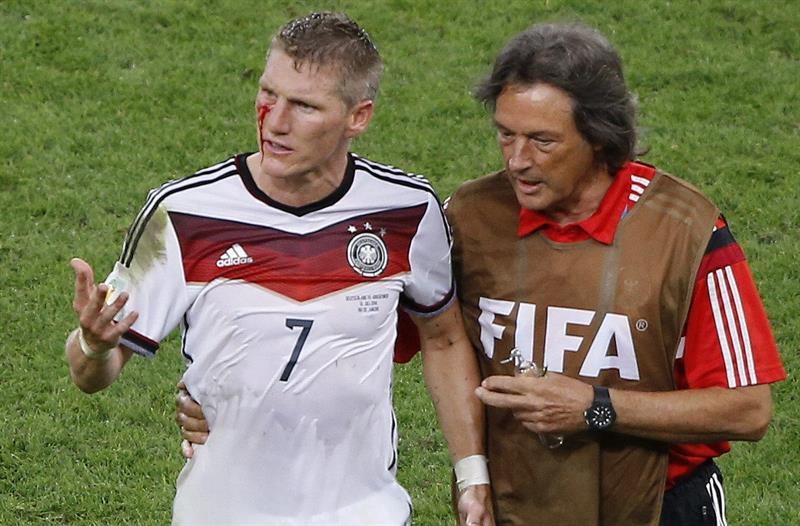 Tras un golpe de Agüero en un balón dividido, el centrocampista alemán Bastian Schweinsteiger acabó sangrando por el pómulo derecho.