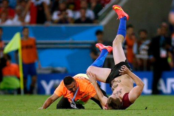 Un espontáneo se coló en la final del Mundial, cuando quedaba poco para llegar al final de los 90 minutos. Las cámaras de televisión no ofrecieron la imagen, pero aquí se ve que fue placado por varios miembros de seguridad.