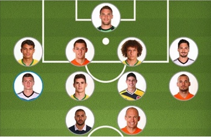 El once ideal del torneo de Brasil está formado por Neuer, el portero de Alemania. Como defensas Thiago Silva y David Luiz de Brasil, Hummels de Alemania y De Vrij de Holanda. Cuatro centrocampistas con Toni Kroos de Alemania, Oscar de Brasil, Sneijder de Holanda y James Rodriguez de Colombia que además ha sido máximo goleador del torneo. Y en la delatera, no está Leo Messi. Como mejores atacantes del Mundial aparecen Karin Benzema de Francia y Robben de Holanda.