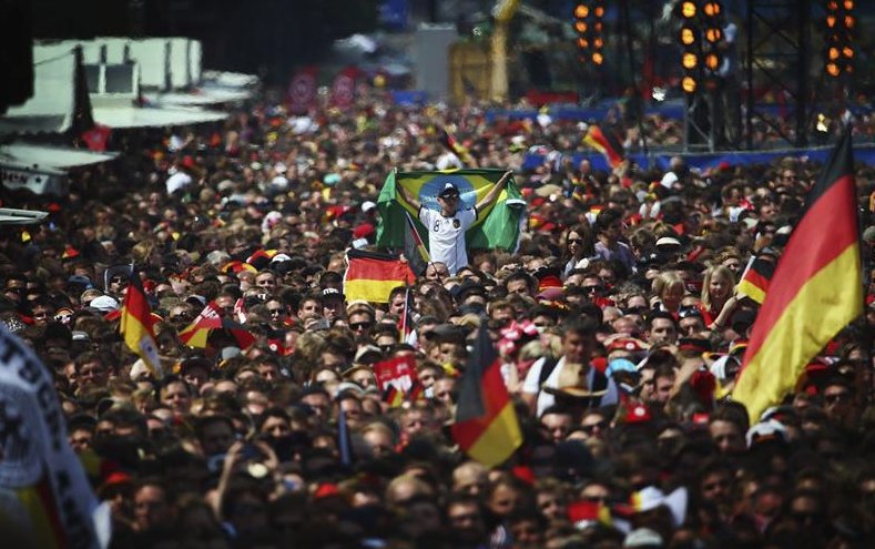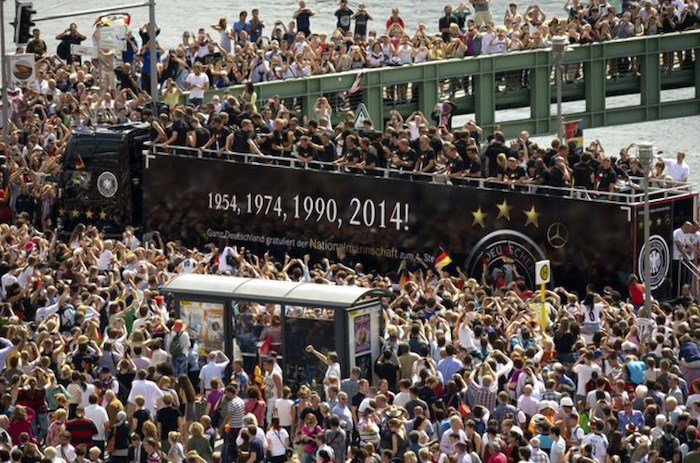 Los jugadores de la selección alemana recorren la llamada milla de los aficionados en un camión descapotable que recuerda las cuatro Copas del Mundo que ha ganado: Suiza'54, Alemania'74, Italia'90 y Brasil 2014.