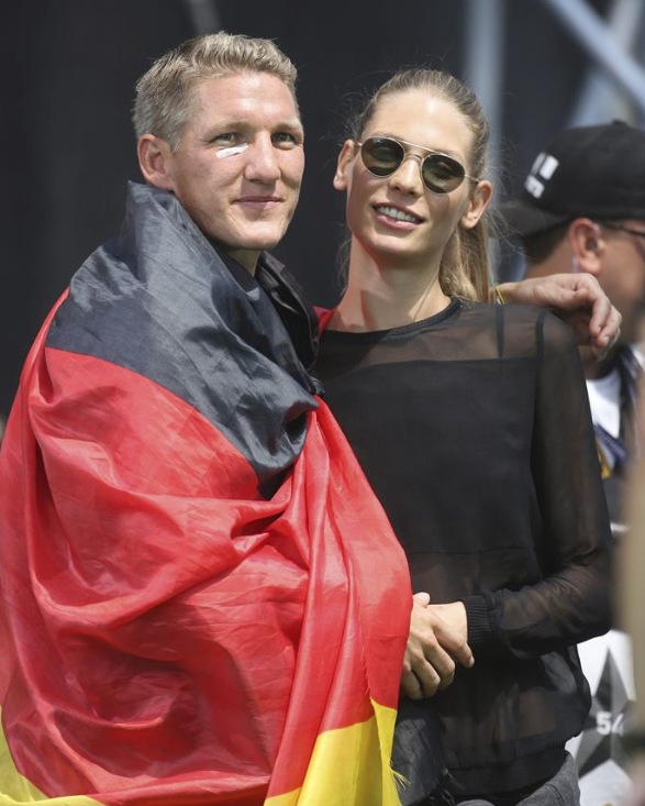 Tras el capitán Philipp Lahm, el centrocampista Bastian Schweinsteiger fue el segundo futbolista alemán que bajó del avión que aterrizó con los campeones en el aeropuerto Tegel de Berlín. En la imagen, el futbolista del Bayern aparece junto a su novia, la modelo Sarah Brandner.