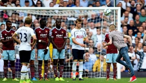 La primera jornada de la Premier League está deparando varias anécdotas, y una de ellas se produjo en el estadio Boleyn Ground -conocido como Upton Park por su localización- durante el derbi londinense entre el West Ham y el Tottenham (0-1). A los 18 minutos de la segunda parte, un espontáneo saltó al terreno de juego, cuando Christian Eriksen se disponía a tirar una falta a favor de los Spurs. Pero lo mejor de todo llegó cuando el propio aficionado sorprendió a todo el mundo al ser él quien golpeó el balón, pasándolo por encima de la barrera y colocándolo entre los tres palos, aunque el portero español Adrián adivinó sus intenciones y atrapó la pelota.