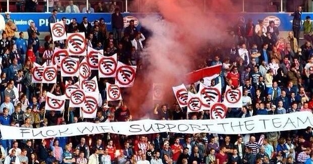 Así, en una pancarta se podía leer "Fuck wi-fi, support the team" (Que le den al wifi, anima al equipo) y con varios estandartes en los que aparecían los indicadores de cobertura tachados.