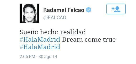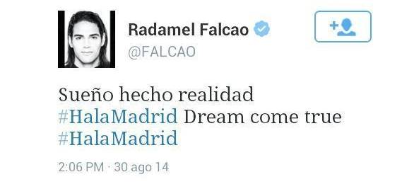 — Radamel Falcao (@FALCAO) agosto 30, 2014
