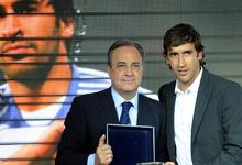 Florentino Pérez, junto a Raúl González en un acto celebrado en el Bernabéu en julio de 2010. | Archivo