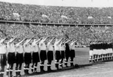 Jugadores ingleses y alemanes realizando el saludo nazi en el Olímpico de Munich.