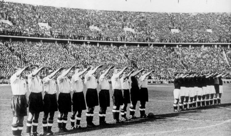 Poco antes de saltar al terreno de juego, los futbolistas ingleses recibieron la orden del embajador británico en Alemania, Nevil Henderson, de realizar el saludo nazi mientras sonaba el himno. Los once titulares ingleses, brazo en alto, rindiendo pleitesía al Fuhrer y su régimen. Una imagen que hoy día sigue abochornando a Inglaterra. No estaba Hitler en el palco, pero sí Goebbels, Goering, Ribbentrop o Hess, entre otras autoridades nazis.