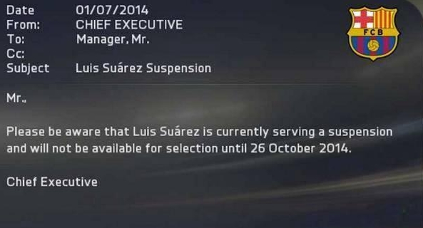 Así, los jugadores del FIFA 15 que deseen incluir a Suárez en sus alineaciones se encontrarán con el siguiente mensaje: