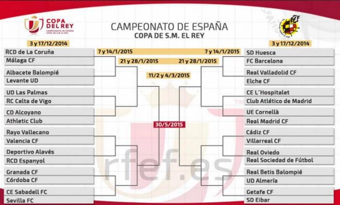 Villarreal y Sevilla, representantes en la Liga Europa, jugarán contra el Cádiz (Segunda B) y el Sabadell (Segunda), mientras que habrá cuatro enfrentamientos entre equipos de la máxima categoría: Rayo Vallecano-Valencia, Getafe-Eibar, Granada-Córdoba y Deportivo-Málaga. Además, habrá otro duelo andaluz entre el Betis y el Almería, y el otro equipo superviviente de Segunda B, el Oviedo, se enfrentará a la Real Sociedad.