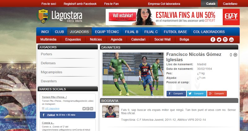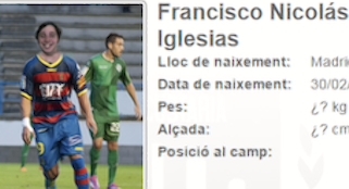 La ficha del supuesto futbolista es acompañada por un fotomontaje en el que Nicolás aparece jugando con el Llagostera.