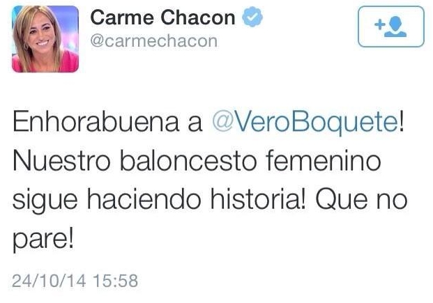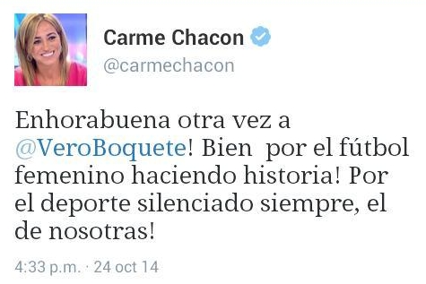 La delantera gallega, de 27 años, ha recibido numerosos mensajes de felicitación en Twitter por este logro. Entre ellos el de Carme Chacón, quien fuera ministra de Defensa y Vivienda durante los gobiernos de José Luis Rodríguez Zapatero. El problema de Chacón es que se ha confundido de deporte.