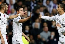 Benzema celebra con James y Cristiano su gol al Malmoe. | EFE
