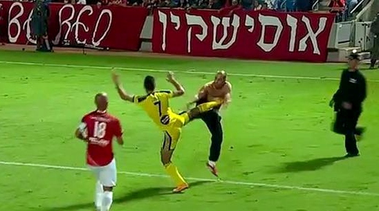 El derbi de Tel Aviv entre el Hapoel y el Maccabi tuvo que de ser suspendido después de Eran Zahavi, del Maccabi, se enfrentara a puñetazos y patadas con un aficionado que saltó al campo para agredirle y se desatara una vergonzante batalla campal.