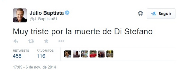 Hay lapsus y lapsus, pero el último que ha protagonizado Julio Baptista en Twitter será recordado durante mucho tiempo. El exfutbolista brasileño del Real Madrid, que actualmente milita en el Cruzeiro de su país, parece no haberse enterado de la muerte de Alfredo di Stéfano hasta este miércoles, cuando la Saeta Rubia falleció el pasado 7 de julio.