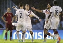 Toni Kroos es felicitado por su gol a la selección española. | EFE