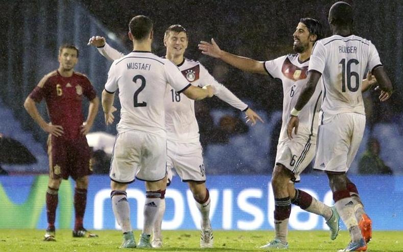 Después de la convicente goleada ante Bielorrusia (3-0), en la fase de clasificación para la Eurocopa, Del Bosque presentó muchas novedades en su once inicial, como Morata, Raúl García, Bruno o Bernat. Y también la del delantero del Celta Nolito, que debutaba con la selección española, como titular y ante su público. Si España tenía bajas ilustres como las de Iniesta, Diego Costa, Silva, Cesc o Carvajal, entre otros, Alemania no le fue a la zaga, pues Joachim Löw no pudo contar con Neuer, Lahm, Schweinsteiger, Schürrle o Kramer. Así, el técnico de Schonau presentó en el equipo titular a jugadores desconocidos para el aficionado medio español como Rudy, Rudiger, Zieler o Volland. Eso sí, junto a ellos, pesos pesados del fútbol teutón como Müller, Khedira o Götze.