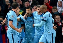 Kun Agüero (i) es felicitado tras marcar uno de sus tres goles al Bayern. | EFE