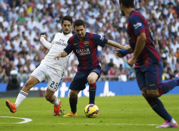 Dieter comenta con Guillermo Domínguez, G. Heredero, D. Vinuesa y S. Valentín la retirada de una amarilla a Messi mientras se la mantienen a Isco.