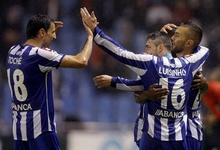 Luis Fariña (d) es felicitado por su gol al Elche. | EFE