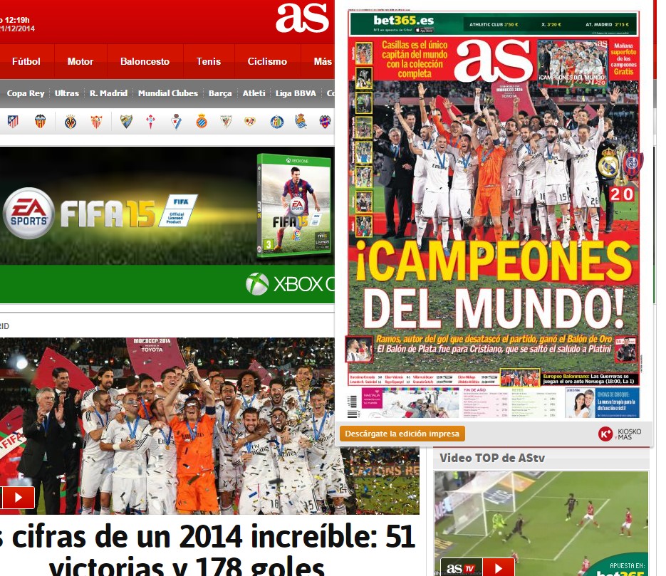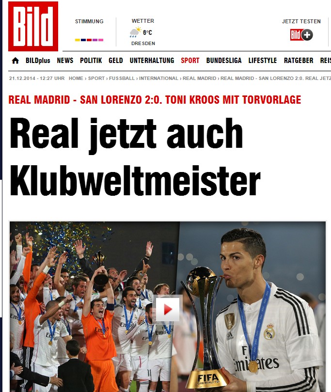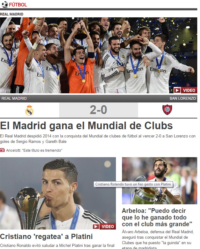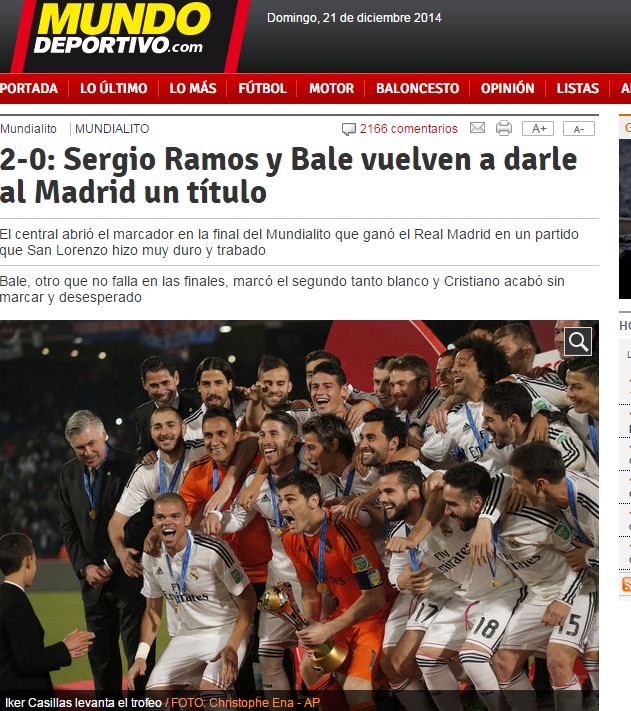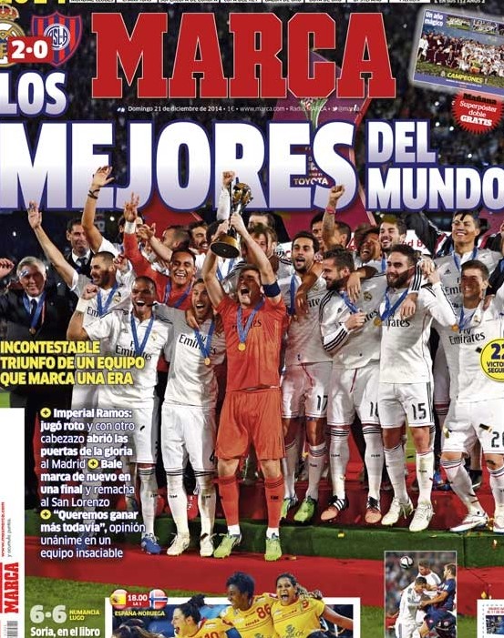 Periódicos de todo el mundo recogen el título conseguido este sábado por el Real Madrid ante el San Lorenzo de Almagro. El Madrid se convierte en el mejor club del mundo con su nuevo título.