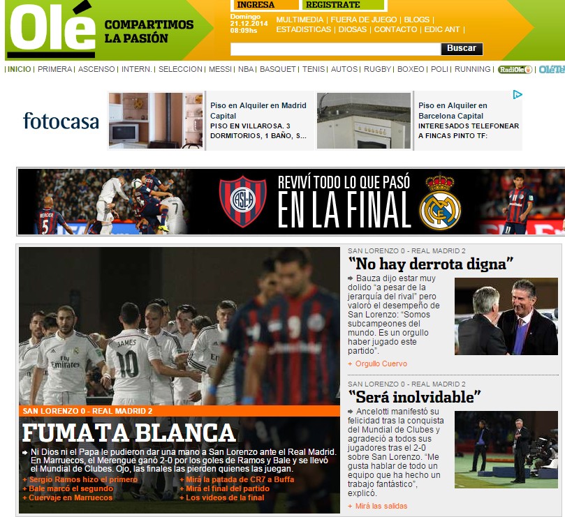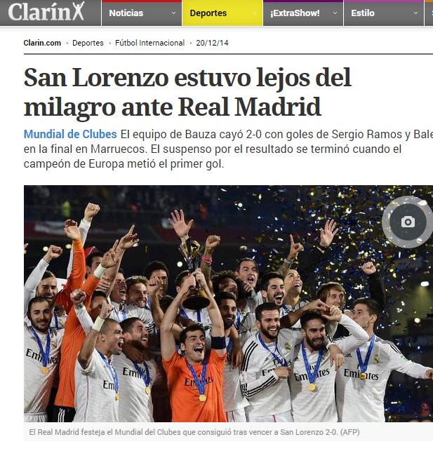 El rotativo argentino Clarín destacó la superioridad del rival, "San Lorenzo estuvo lejos del milagro ante el Real Madrid".