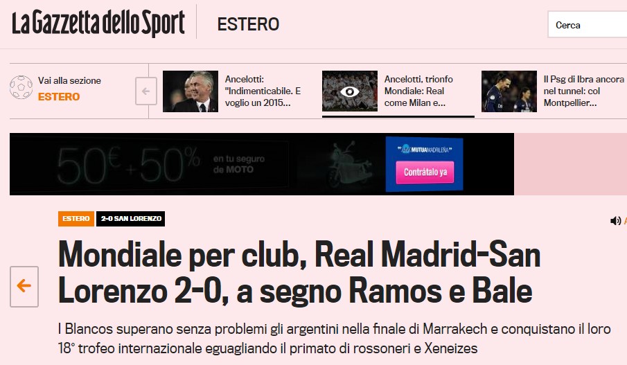 El periódico italiano La Gazzeta dello Sport centró su atención en la figura de Ancelotti. "Ancelotti, triunfo Mundial".