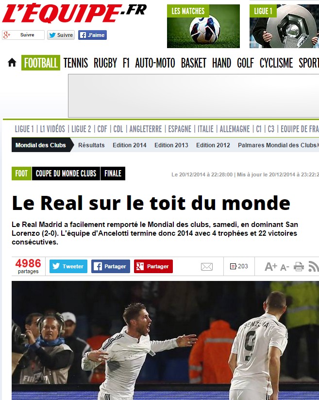 "El Madrid, en la cima del mundo", afirma el diario francés L'Equipe.