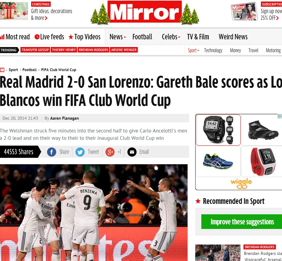 El periódico inglés Daily Mirror inclina su balanza en Gareth Bale. "Bale marca y los blancos ganan el Mundial".