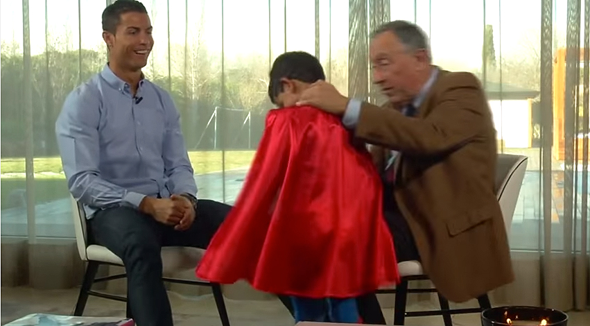 El hijo de Cristiano Ronaldo interrumpió, disfrazado de Superman, una entrevista en la Federación Portuguesa de fútbol que el periodista luso Marcelo Rebelo de Sousa estaba realizando al ganador del Balón de Oro 2014.