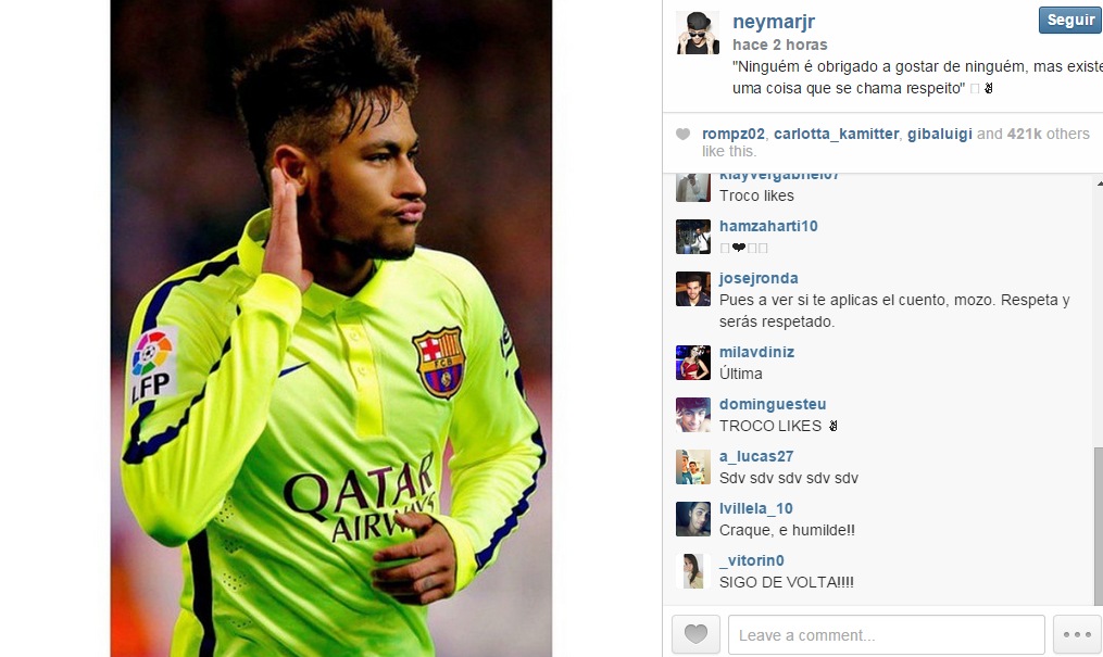 Un día después del choque en el Calderón, correspondiente a la vuelta de cuartos de final de la Copa del Rey, el brasileño ha escrito en su cuenta de Instagram que no se siente obligado a gustar a todo el mundo cuando juega al fútbol, pero que "hay una cosa que se llama respeto".