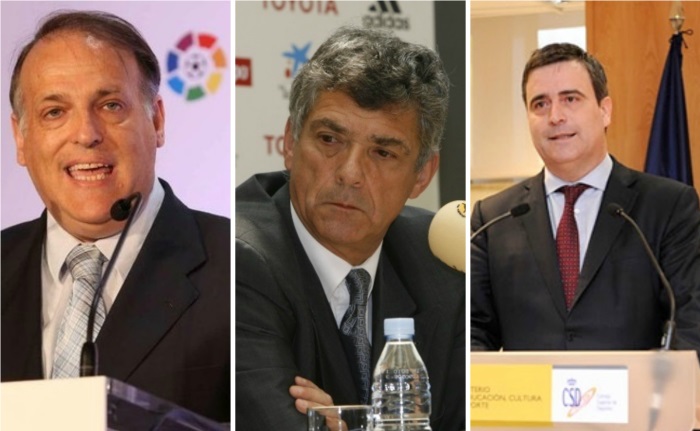 En pleno proceso de expulsión de los violentos de los estadios, en el fútbol español ha estallado una guerra que venía tiempo preparándose. La tricefalia actual que gobierna el deporte más seguido del país ha terminado por sacar los trapos sucios a la luz en la lucha por el poder que mantienen el presidente de la Federación Española de Fútbol (RFEF), Ángel María Villar, el presidente de la Liga de Fútbol Profesional (LFP), Javier Tebas, y el presidente del Consejo Superior de Deportes, Miguel Cardenal.