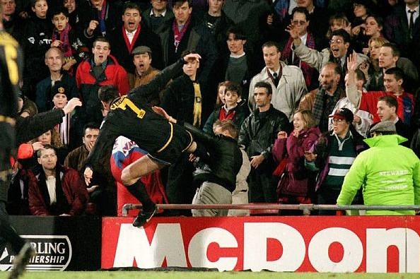 ¿Quién no recuerda esta famosa patada a un aficionado del Crystal Palace, allá por 1995? Y no es único incidente. En 2004, ya retirado y dedicado al fútbol playa, se enfrentó con aficionados en Mallorca cuando jugaba con su selección contra España. Les tiró sillas y subió a la grada a pegarse.