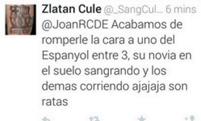 "Acabamos de romperle la cara a uno del Espanyol entre tres, su novia en el suelo sangrando y los demás corriendo, jajaja, son ratas", escribió en la red social después de intercambiar amenazas con otros usuarios y asegurar que era algo planificado previamente al encuentro.