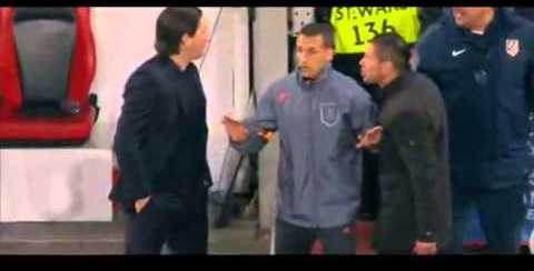 El entrenador del Atlético de Madrid, Simeone y su segundo, Burgos, se encararon con el técnico del Leverkusen, Roger Schmidt, ante las númerosas faltas que estaba recibiendo el equipo madrileño.