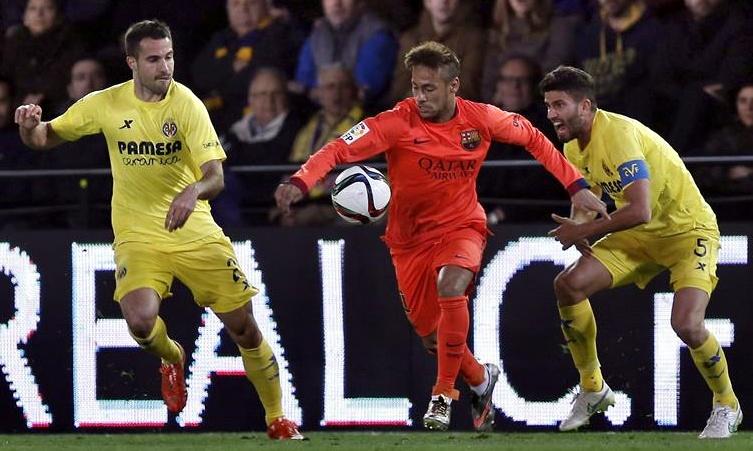 Un doblete de Neymar, con otro de Luis Suárez entre medias, guiaron al conjunto azulgrana, que se vio favorecido por una durísima entrada de Pina en la segunda parte sobre el brasileño que le costó la tarjeta roja directa. Jonathan dos Santos puso el empate a uno, pero no pudo hacer más el cuadro amarillo, fallón de cara a puerta.