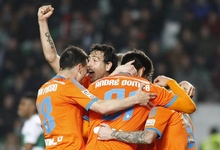 Los jugadores del Valencia celebran el segundo goles del equipo, obra de Paco Alcácer. | EFE