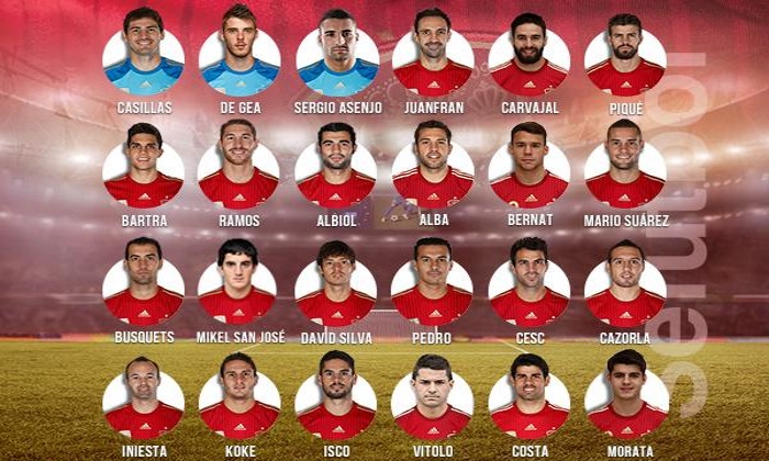 Delanteros: Pedro Rodríguez (Barcelona), Álvaro Morata (Juventus), Diego Costa (Chelsea/ING) y Vitolo (Sevilla)