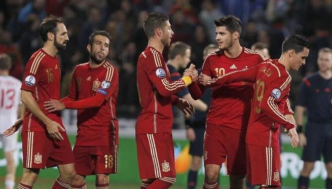 España: Casillas; Juanfran, Piqué, Sergio Ramos, Jordi Alba; Busquets, Koke; Iniesta, Cesc, Silva; Morata o Isco.