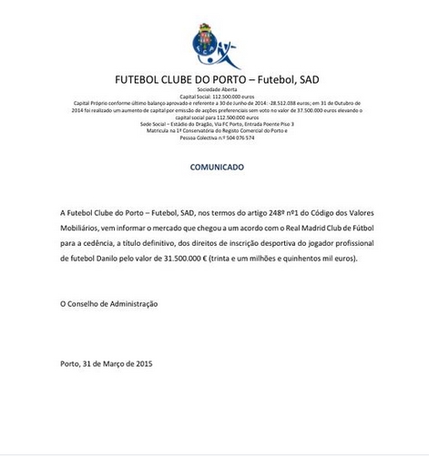 También el propio club portugués confirmaba el traspaso de Danilo en un comunicado en el que iba más allá, al asegurar que el valor del traspaso es de 31,5 millones de euros.