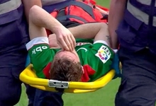 El jugador navarro se lesionó en un lance de juego con Banega y tuvo que abandonar el campo en camilla antes del descanso.