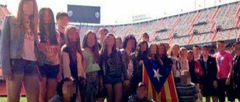 Los estudiantes, del centro concertado Xarxa Escola, en la localidad de Berga, se encontraban realizando el tour por el estadio valencianista cuando se detuvieron sobre el césped para hacerse uan foto todos juntos. Fue entonces cuando sacaron la bandera independentista catalana.