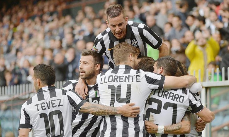 La Juventus formó con Buffon; Barzagli, Bonucci, Padoin, Lichtsteiner, Marchisio; Vidal, Sturaro, Pereyra; Tévez y Llorente.