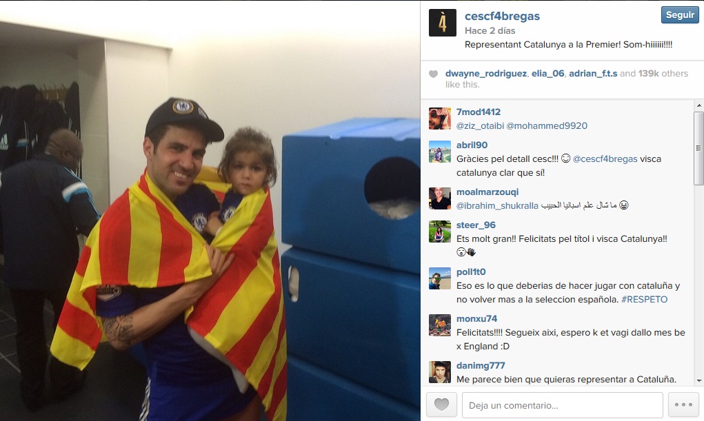 Cesc se encargó de sacar una bandera catalana y posar con ella junto a sus compañeros. El propio futbolista colgó la foto envuelto en la señera en su cuentas personales de Twitter e Instagram, algo que ha generado numerosos comentarios al respecto. De hecho, en su perfil de Instagram comentó en catalán una de las imágenes en la que habla de que ejerce como "representante de Cataluña".