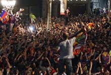 Unos 6.000 aficionados culés se reunieron en la plaza de Cataluña y en torno a la fuente de Canaletas para celebrar el título de Liga.